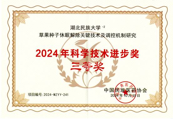 近日,2024年中国民族医药协会科学技术奖颁奖大会暨院士、国医大师学术交流大会在京召开。经过申报、内审和专家委员会初评、终评、公示、报备等环节和程序,由湖北民族大学生物资源保护与利用湖北省重点实验室邓志军团队申报的《草果种子休眠解除关键技术及调控机制研究》被授予“2024年中国民族医药协会科学技术进步奖”三等奖。