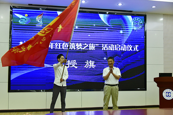 我校党委副书记、校长顿祖义宣布:第六届中国国际“互联网+”大学生创新创业大赛湖北民族大学初赛“青年红色筑梦之旅”活动开幕!随后,亲自为参加“青年红色筑梦之旅”活动的学生代表授旗。