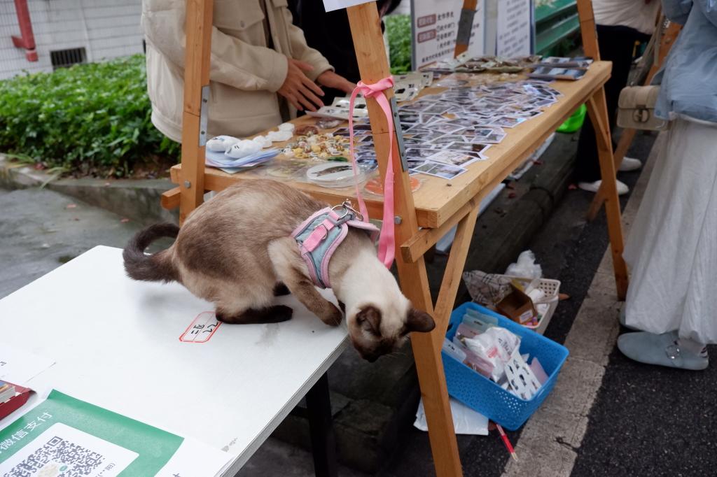 手作创意体验区同样人气高涨。这里不仅有可供DIY涂鸦的石膏娃娃、琳琅满目的彩珠供师生串制心仪的手链项链,还有柔软可爱的玩偶,以及以校园小猫为原型设计的“吧唧”和吊坠等文创产品。更惊喜的是,“小猫学长”也亲临现场,萌趣互动将氛围推向高潮。