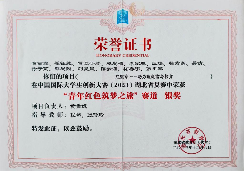 作为“红徽章”项目负责人之一,她自加入以来便全力推动理想信念教育的创新传播。该项目自2019年成立后,从宣讲革命英雄张富清的事迹起步,逐步拓展至打造民族歌舞剧并赴武汉、北京展演,进而设计革命军人IP、开展“红色+绿色”助农直播,并开创“光的N次方”公益服务新模式,实现了红色文化多元化与年轻化的表达。依托出色的演讲、主持与组织能力,她带领团队实现成绩跨越,从2023年获湖北省银奖,到如今接连斩获省级金奖与国家级铜奖,用一份沉甸甸的国字号奖项,为他们的奋斗历程作出了最有力的注解。