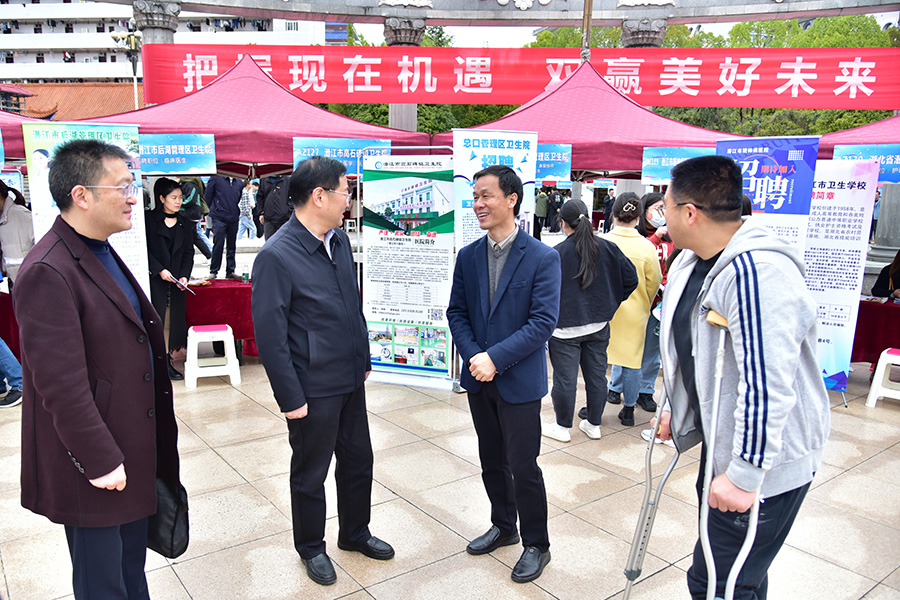 潜江市卫健委党组成员、副主任熊元强带领潜江市妇幼计生中心、潜江市中医院等17家单位组团参加本次招聘会,学校为他们设置了单独的展区。熊元强感谢学校给他们提供这么好的平台,并希望双方进一步拓展合作的深度和广度。