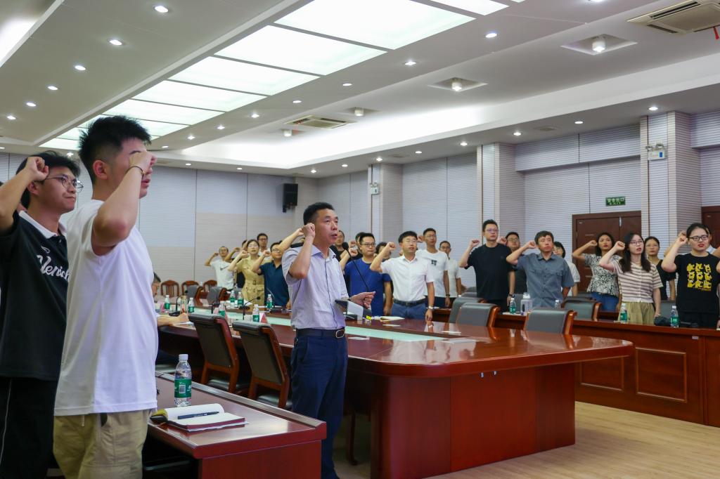 “我志愿成为一名人民教师,忠诚党的教育事业,遵守教育法律法规,履行教书育人职责,引领学生健康成长,践行‘博学博爱,立人达人’的校训,传承‘艰苦奋斗,甘于奉献,自强不息,追求卓越’的民大精神,做到有理想信念、有道德情操、有扎实学识、有仁爱之心,为教育发展、国家繁荣和民族振兴努力奋斗!”在教师发展中心谢坤武主任的带领下,全体新入职教师进行了庄严宣誓。
