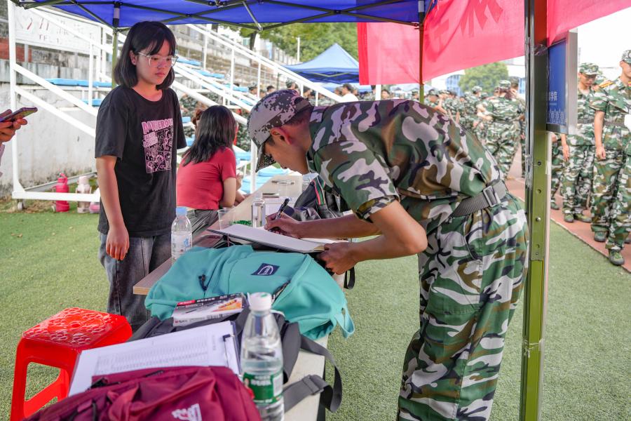 记者在军训场看到,各学院(部)为新生设立了可供休息的大本营,在炎炎夏日中为新生送上一份清凉。志愿者秉持着“我为师生办实事”精神,在体育场上不停奔波,为参训学生提供贴心服务。