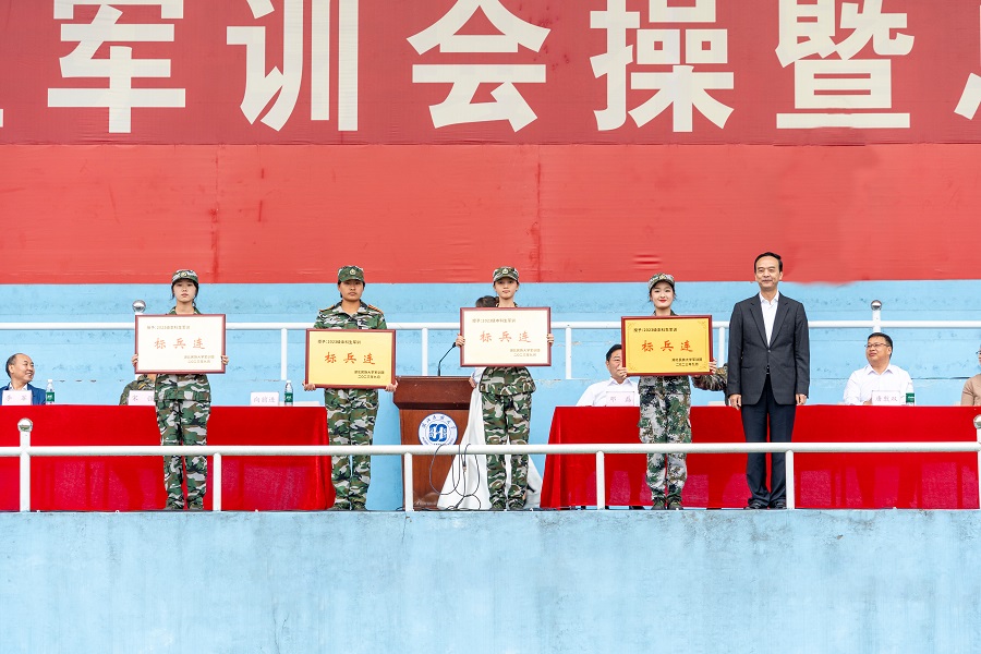 湖北民族大学保卫部部长周代明主持大会。军训团参谋长吴华平通报军训成绩,李军宣读2023级本科生军训团表彰文件,音乐舞蹈学院、经济与管理学院、体育学院、马克思主义学院荣获“标兵连”称号,美术与设计学院、教师教育学院、文学与传媒学院、医学部、化学与环境工程学院、民族学与社会学学院获得“优秀连”称号,林学园艺学院、智能科学与工程学院、生物与食品工程学院、外国语学院、数学与统计学院、法学院获得“优胜连”称号,李文杰等8位教官授予“优秀教官”称号,刘馨语等92名学员获得“优秀学员”称号。参会领导分别为受到表彰的学院、教官及学员颁奖。