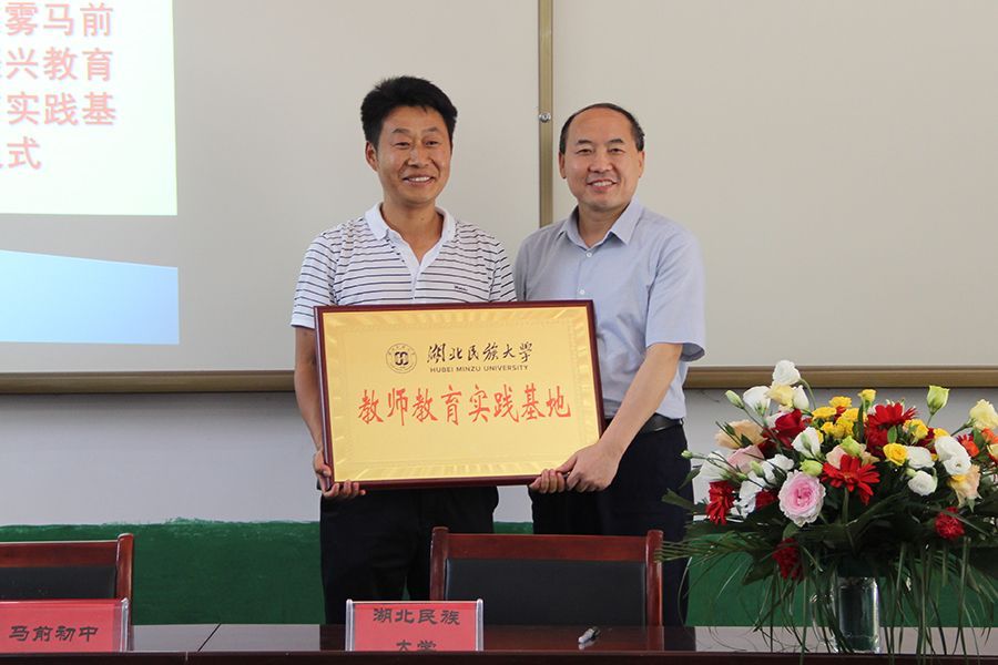 党委常委、副校长李军(右)代表学校与马前初中签订实习基地协议并授牌