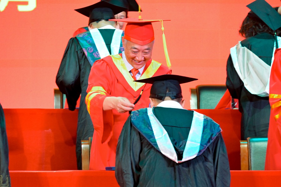 学位授予仪式在欢快的旋律中正式开始。戴清堂、顿祖义、邓磊、张宏磊、田景福、李军、刘志军、刘伦志及学校学位评定委员会成员为毕业学子们一一拨正流苏、颁发学位证书。2025届学子依次与老师握手、致谢鞠躬、合影留念,每一个动作都凝聚着对母校的感恩与不舍。