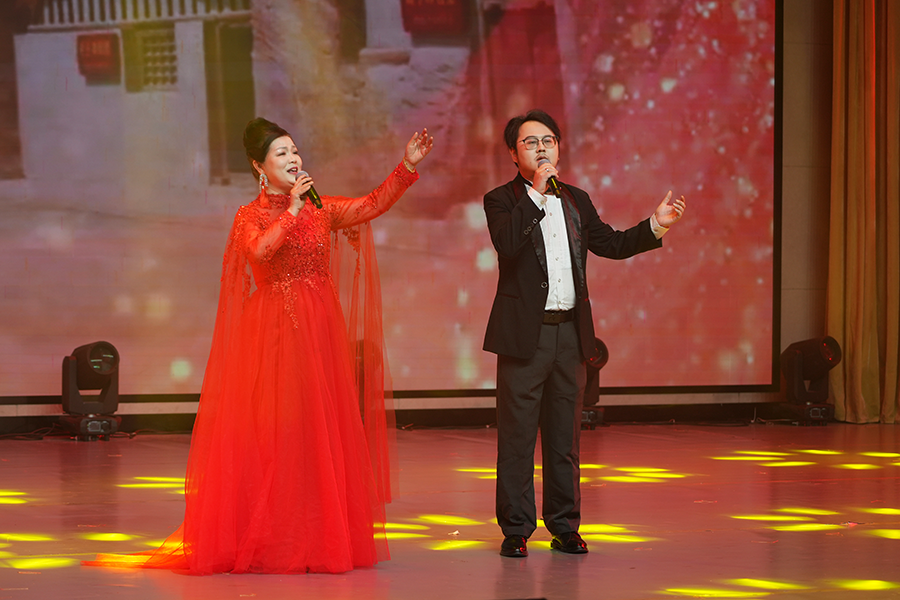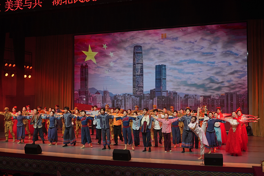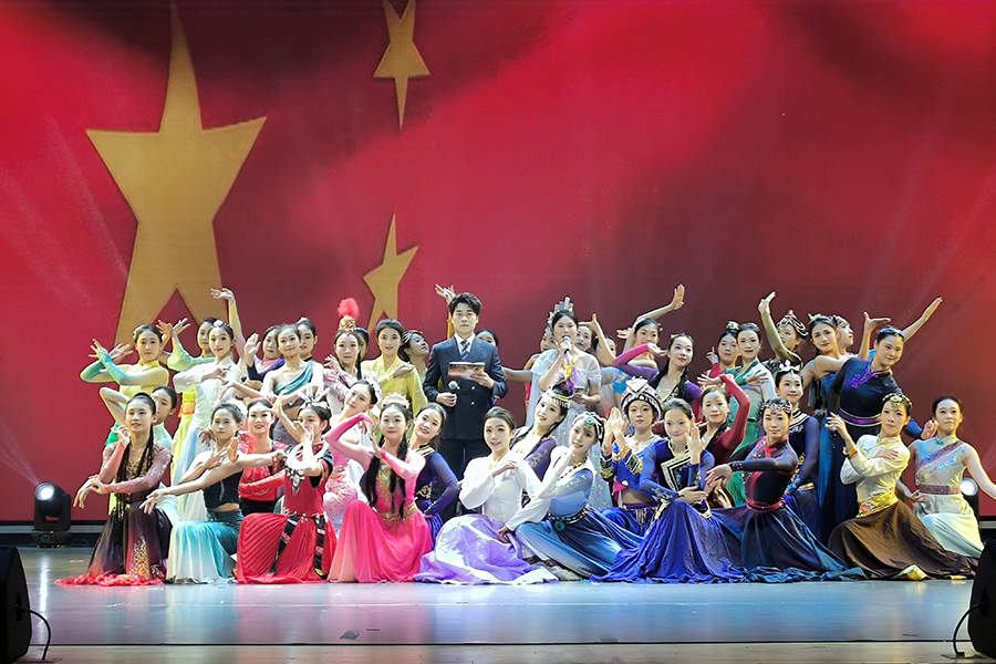 开场舞《锦绣画卷》诗意盎然,爵士舞《POWER》活力四射,民乐《兰亭序》古韵悠长,跨界作品《梁祝》创新演绎经典,戏曲串烧《京黄和鸣》彰显非遗魅力,新中式走秀《中国风》传承中华美学。红色篇章中,舞蹈《唱支山歌给党听》讲述土家青年投身革命的觉醒历程,音舞诗画《东方曙光》通过时空对话再现党的百年奋斗,教师献唱《把一切献给党》抒发育人初心。晚会在合唱《我乘着风飞过来》和全场齐唱《歌唱祖国》中圆满落幕。
