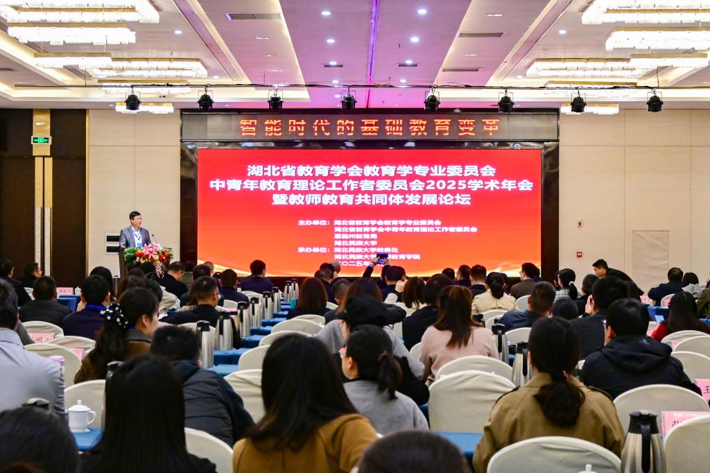 10月25日,湖北省教育学会教育学专业委员会、中青年教育理论工作者委员会2025学术年会暨教师教育共同体发展论坛在恩施召开。本次会议由湖北省教育学会教育学专业委员会、中青年教育理论工作者委员会、恩施州教育局及湖北民族大学联合主办,湖北民族大学教务处、教师教育学院共同承办。来自省内外的专家学者和恩施州-湖北民族大学教师教育共同体成员单位代表260余人参会。湖北省教育学会会长王坤庆,湖北省教育学会教育学专业委员会理事长涂艳国,湖北省教育学会中青年教育理论工作者委员会理事长岳伟,恩施州人民政府教育督导室副县级督学唐鑫鑫,湖北民族大学党委常委、副校长李军出席会议并讲话。华中师范大学教育学院田友谊教授主持开幕式。