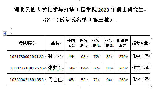 湖北民族大学化学与环境工程学院2023年硕士研究生 招生考试复试名单(调剂第三批)