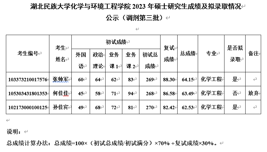 湖北民族大学2023年硕士研究生成绩及拟录取情况公示(调剂第三批)