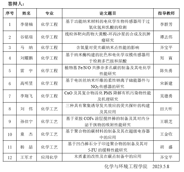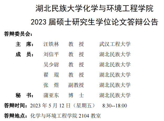 湖北民族大学化学与环境工程学院2023届硕士研究生学位论文答辩公告(2)