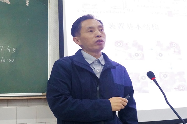 报告伊始,他从光镊技术的发展、光镊的模型和力学效果、光镊技术的应用作出讲解。接着,他分别对“光镊辅助的液相芯片:装置的构建及应用”“近红外光镊捕获单个上转换发光纳米粒子”“基于微流控芯片的多功能光镊装置”三个方面进行解说分析及总结。随后,他用事例类比,图表模型相结合的方式,细致介绍光镊技术,并向听众展示光镊装置照片,指出关于光镊研究项目的伟大前景。最后,现场师生踊跃提问,唐宏武耐心详细的解答。