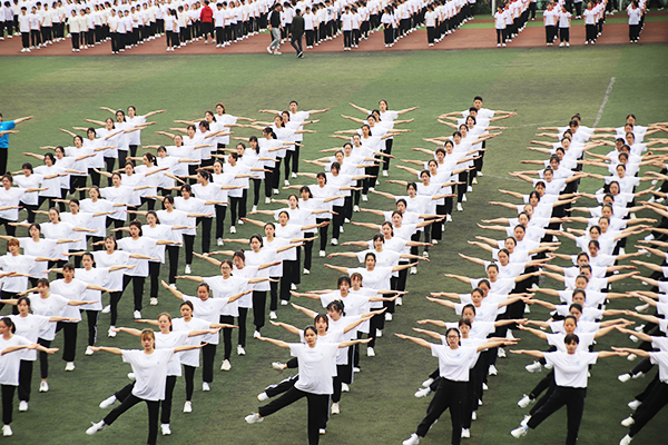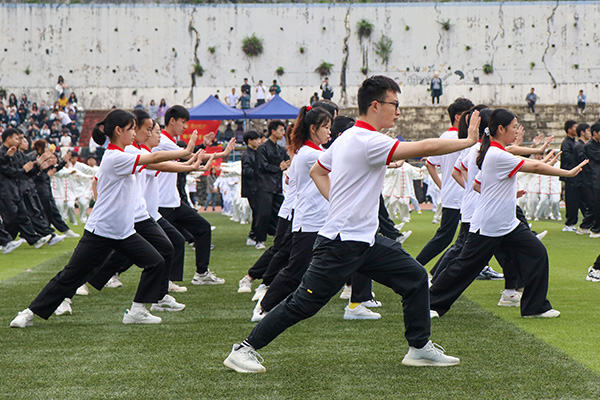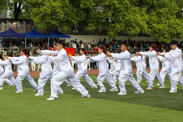 阳光普照大地,万物充满生机。开幕式后,太极拳和师生广播体操比赛正有序进行。