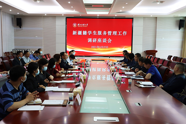 本网讯(通讯员 TZB/文 张倩雯/图)5月27日下午,新疆驻湖北工作组党委书记、组长杨骞,省民宗委民族关系协调处二级调研员阮正云等一行4人到我校调研新疆籍少数民族学生教育服务管理工作。党委常委田景福,新疆内派教师、少数民族学生专职辅导员和部分新疆籍学生代表,恩施州民宗委负责同志及学校相关学院和职能部门负责人参加调研座谈。