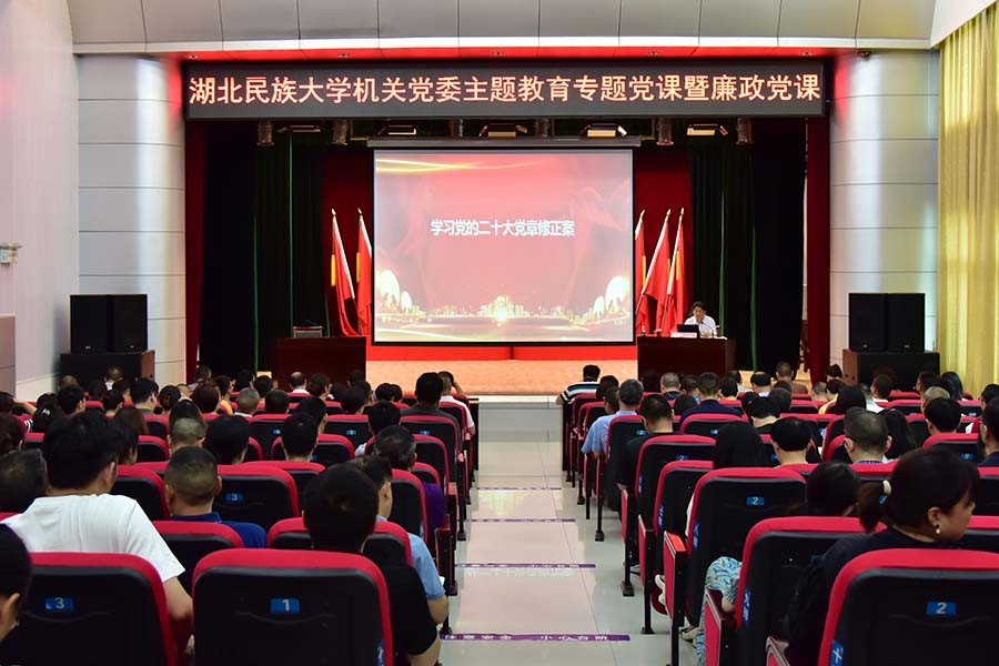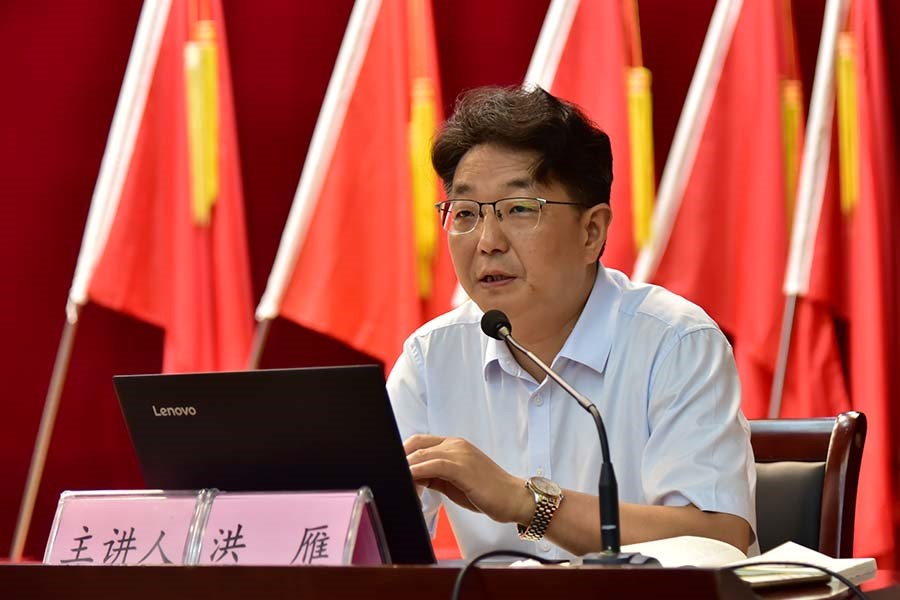 洪雁围绕“党的二十大党章修正案”主题,深刻分析了二十大党章修改的依据、原则和重大意义,详细解读了二十大党章修改的主要内容,重点解读了新时代党的干部和党的纪律方面的新论述、新要求,全面阐述深入学习贯彻二十大党章的具体要求。洪雁表示,党章是立党、管党、治党的总章程,党章是党的根本大法,党章是党的历史发展的权威记录,党章的生命力在于执行,他要求党的各级组织和全体党员要在以习近平同志为核心的党中央坚强领导下,高举中国特色社会主义伟大旗帜,弘扬伟大建党精神,深刻领悟“两个确立”的决定性意义、增强“四个意识”、坚定“四个自信”、做到“两个维护”,更加自觉地学习党章、遵守党章、贯彻党章、维护党章,为全面建设社会主义现代化国家、全面推进中华民族伟大复兴而团结奋斗!