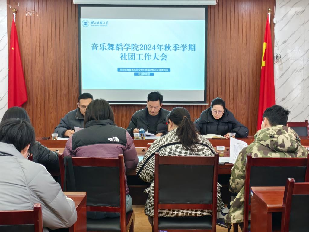 2024年12月20日,湖北民族大学音乐舞蹈学院社团工作大会于学院四楼会议室召开。出席本次会议的有音乐舞蹈学院院长谷秋阳、党总支副书记邓丽、团总支书记张翰庭,社团指导教师朱蓉、谷穗、龙雅婷、张然、王多,以及团总支社团管理部成员,七大社团(合唱团、民乐团、戏曲团、舞蹈团、红徽章协会、茶文化协会、鸽笼俱乐部 )负责人。