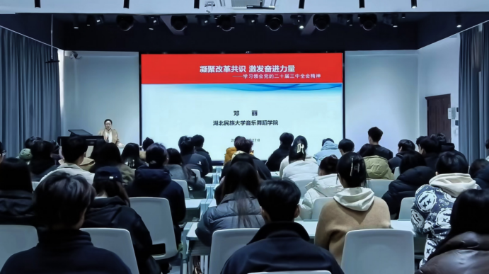 11月28日14:30,音乐舞蹈学院党总支邀请湖北民族大学党委宣传部副部长毕曼同志,为音乐舞蹈学院全体教职工进行党的二十届三中全会精神专题宣讲,音乐舞蹈学院党总支书记张蕊同持主持,音乐舞蹈学院全体教职工参加。毕部长全面解读了党的二十届三中全会精神,重点阐释了湖北、恩施及湖北民族大学在行的历史时期面临的新机遇和新挑战。为音乐舞蹈学院的高质量发展指明了方向,引发了老师们的强烈共鸣。