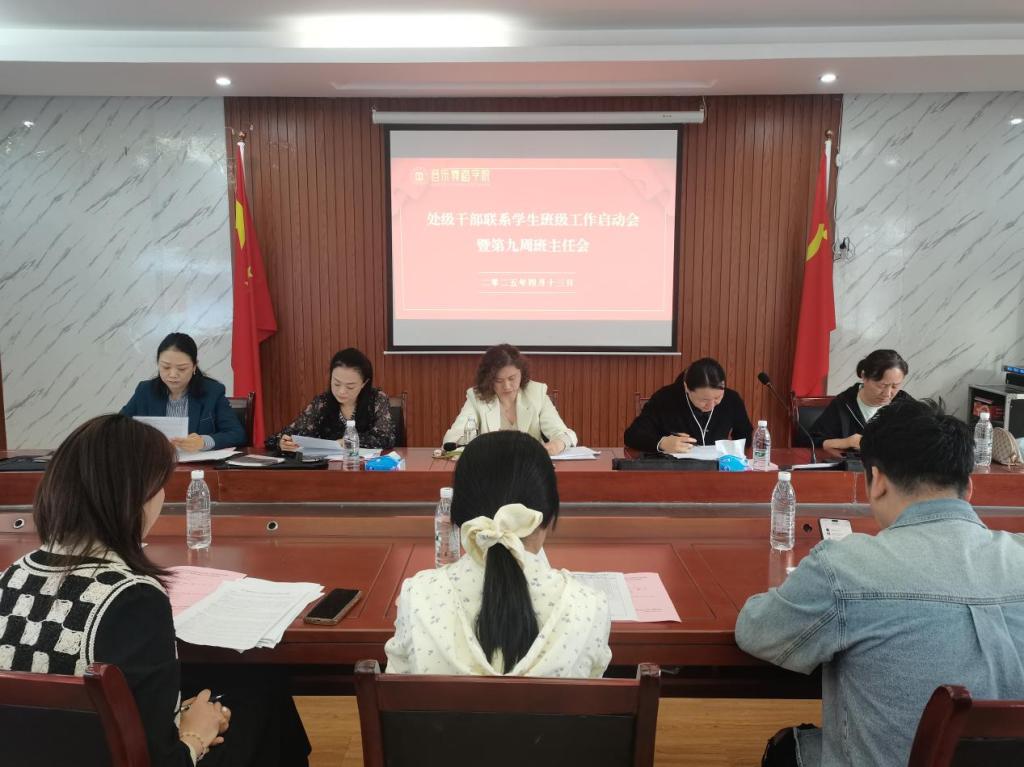 4月13日,湖北民族大学音乐舞蹈学院处级干部联系学生班级工作启动会暨第九周班主任会议在学院四楼会议室举行。此次下沉音乐舞蹈学院的处级干部有学校国有资产管理处处长申阿东、离退休工作处副处长黎静文,组织部副部长、党校副校长谢辉,纪委、监察专员办公室综合室主任万力和发展规划处副处长、政策研究室副主任陈磊。学院党总支书记张蕊、副书记邓丽,全体辅导员及班主任出席此次会议。会议由学院学生科科长胡自爱主持。