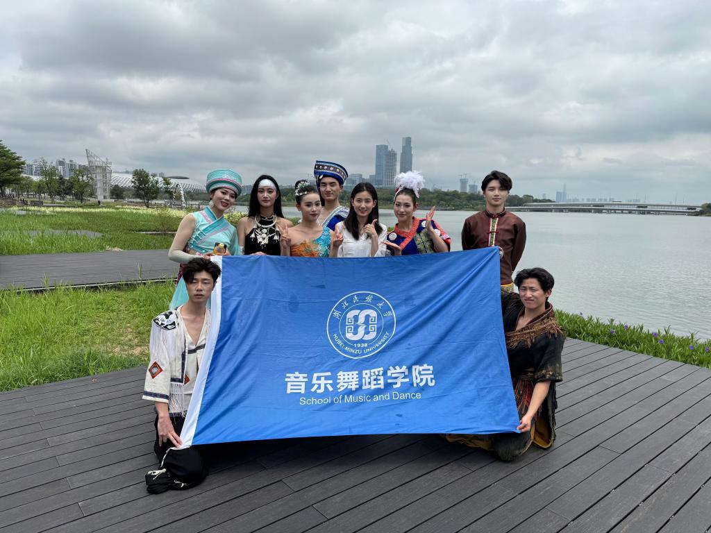 从4月初接到湖北省教育厅关于央视五四特别节目筹备通知以来,湖北民族大学音乐舞蹈学院迅速组建专班,与央视导演组展开深度对接。4月17日至25日,学院师生兵分两路:其中8名舞蹈专业学子跨越1500公里奔赴深圳,在人才公园的现代天际线与天空之境的澄澈水波间,与西北民族大学等五所高校联袂献演《山水画卷》。土家族刺绣纹样在都市光影中流转,苗族银饰脆响与海浪声共鸣,学子们以创新编排让民族服饰化作流动的生态诗篇,在"两山理论"的现代语境下绽放新生。