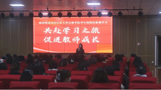 活动伊始,恩施市博文学校艺体骨干教师、湖北民族大学优秀毕业生王梦楠对我院师生表示了热烈欢迎,并希望今后能有更多交流学习机会,携手共研,共同进步。