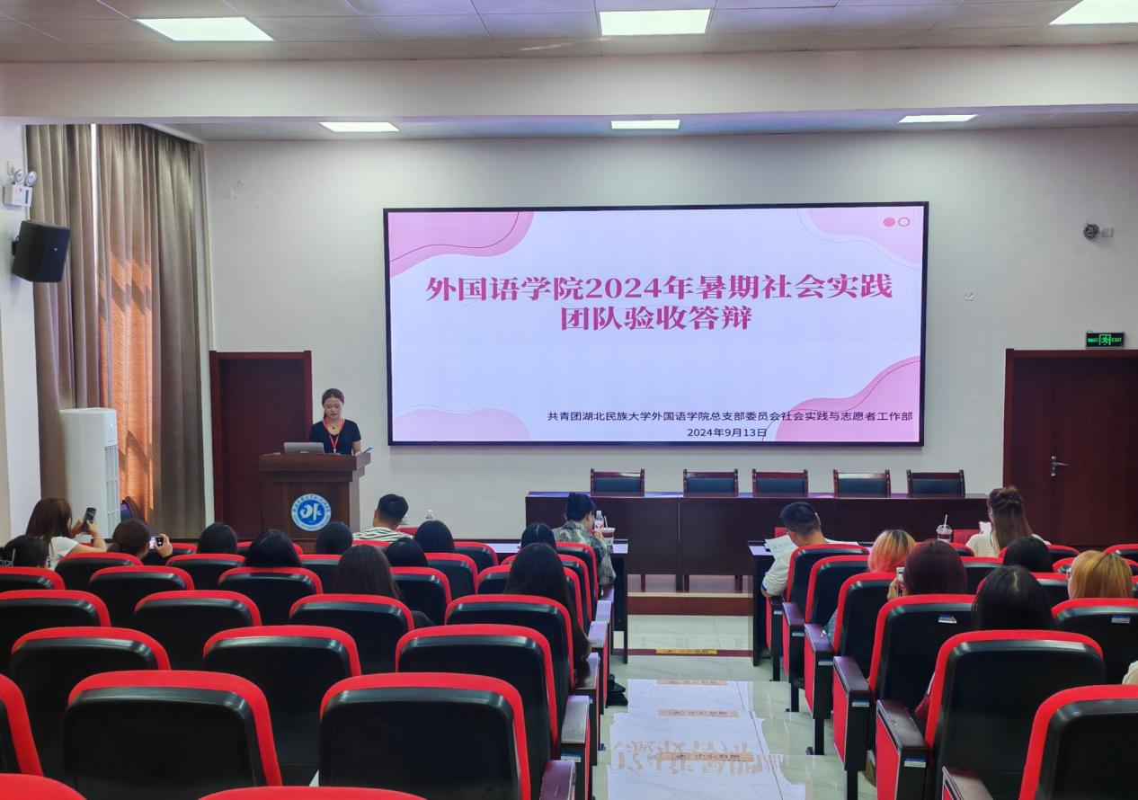 9月13日,湖北民族大学外国语学院2024年“三下乡”暑期社会实践团队验收答辩会在6402报告厅顺利举行。本次验收答辩会共有19支院级团队参与,文学与传媒学院陈思义老师、教师教育学院刘孝语老师、外国语学院章佳蒙老师和黄祖耀老师共同担任本次活动评委。