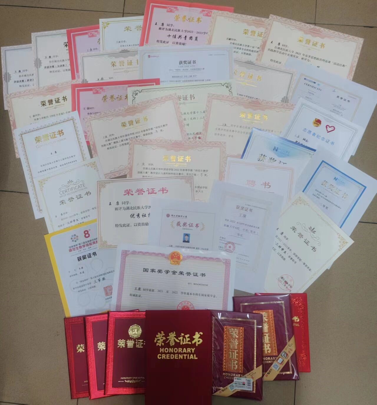 注:王康曾获2023年“田家炳杯”第八届全国师范院校师范生教学技能竞赛三等奖、教学设计技能竞赛三等奖;2022年第十一届“华文”师范院校英语学科师范生教学设计测试三等奖;2022年CATTI杯全国翻译大赛初赛大学A组中英(笔译)二等奖;2022年第六届全国高校商务英语竞赛初赛专业组三等奖;2022年第29届湖北省翻译大赛笔译(专业英语A组)初赛三等奖;2022年“外研社国才杯”全国英语写作大赛校级初赛一等奖、全国英语演讲大赛校级初赛三等奖;2022年第27届中国日报社“21世纪杯”全国大学生英语演讲比赛湖北民族大学校园选拔赛二等奖;2022年湖北省关爱农村留守儿童“七彩假期”志愿服务活动优秀志愿服务团队成员;2022年大学生志愿者暑期文化科技卫生“三下乡”社会实践优秀团队成员;2021-2022学年度优秀社团干部;2021-2022学年度国家奖学金,2022-2023学年度国家奖学金;2021-2023年连续三年获得学校一等奖学金。