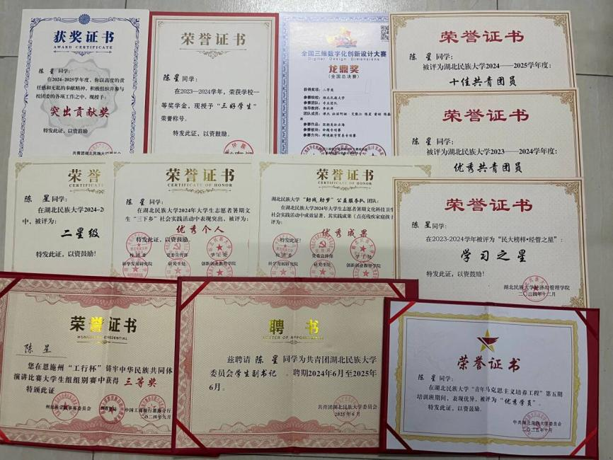 注:连续三年学习成绩排名专业第一;2023-2024、2024-2025 综合测评排名专业第一;2024-2025 三好学生一等奖、国家励志奖学金;全国大学生创新创业训练项目国家级结项;全国三维数字化创新设计大赛二等奖;“正大杯”市场调研与分析大赛省级二等奖;第九届 OCALE 全国跨境电商创新创业能力大赛省级三等奖;恩施州“工行杯”铸牢中华民族共同体意识演讲比赛三等奖;中国国际大学生创新大赛校级金奖3项,银奖 2项,铜奖 2项;第七届“智盛杯”校级二等奖;第二届大学生职业规划大赛校级银奖;2024-2025 年度十佳共青团员;三下乡“优秀个人”“优秀成果”;校团委学生副书记;第五期校“青马班”团支书;“红石榴”宣讲团团长;2024年度“荆楚英才学校”湖北省大学生骨干培训班成员。