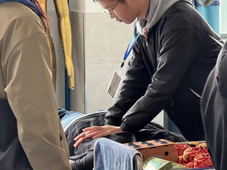 此次活动设置了三大特色疗法体验项目,让师生们全方位感受民族医药的魅力。其中,三百棒疗法,又称“赶棒”或“神棒疗法”,是土家族民间 “防病治病” 的经典疗法,能快速疏通经络、驱散寒湿,有效缓解久坐引发的腰背酸痛、晨起肩颈僵硬等问题。蔡金晓在体验过后反馈:“敲打时感觉温热感慢慢渗进骨头里,原本发僵的肩膀一下子放松了。”土家酒火疗法,将高度药酒、火、推拿三者深度融合,具有驱散深层寒气,促进血液循环的功效。土家推拿同样备受青睐,它针对脊柱两侧的膀胱经穴位,常用揉、推、点按法,可有效缓解腰背酸痛,调节脏腑功能。