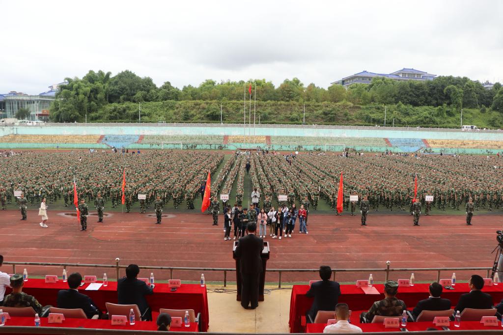 本网讯(记者 王语 黄玉晶 候默/文 王媛 廖子怡/图)9月21日,2020级新生开学典礼暨军训动员大会在五环体育场举行,学校党委书记吴建清,党委副书记、校长顿祖义,恩施州武警支队队长宋强、党委、纪委书记田景福,党委副书记、副校长汪兴平,党委常委副校长祝建波,学校党委团委总会计师余来,军训团参谋长陈飞,教师代表邓伶俐、校友代表汪灵海,学校各单位负责人于主席台就坐。来自全国各地4000余名2020级新生参加开学典礼。副校长汪兴平主持大会。