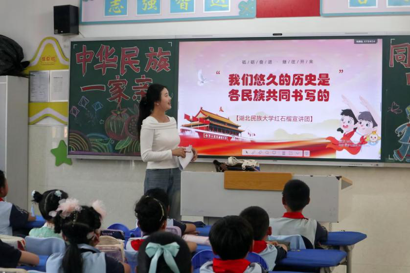 4月18日下午,湖北民族大学红石榴宣讲团走进湖北民族大学附属小学,开展以“我们悠久的历史是各民族共同书写的”为主题的宣讲活动。湖北民族大学红石榴宣讲团10余名成员分组面向湖北民族大学附属小学五、六年级学生展开主题宣讲,校团委书记吴珊,校团委办公室主任雷鹏随行指导。