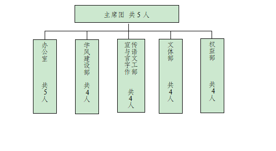 第十七条学生会设办公室、文体部、学风建设部、宣传与语言文字工作部、权益部五个工作部门,在主席团指导下开展工作。各部门工作人员应由学院(部)团组织推荐,经学生工作部和校团委审核后确定。