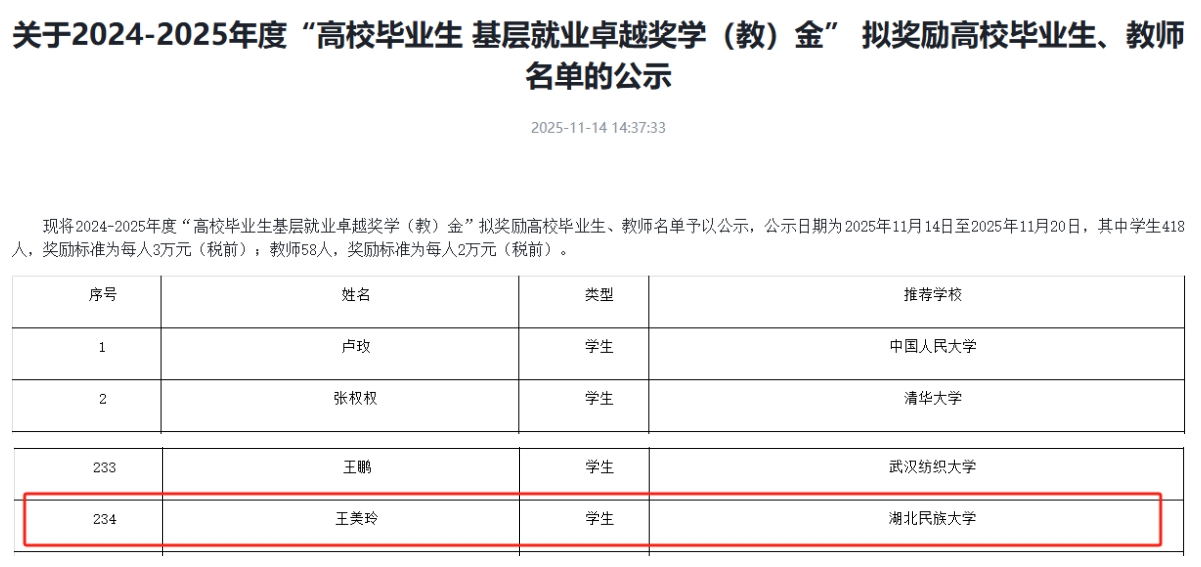 近日,中国教育发展基金会公布2024-2025年度“高校毕业生基层...
